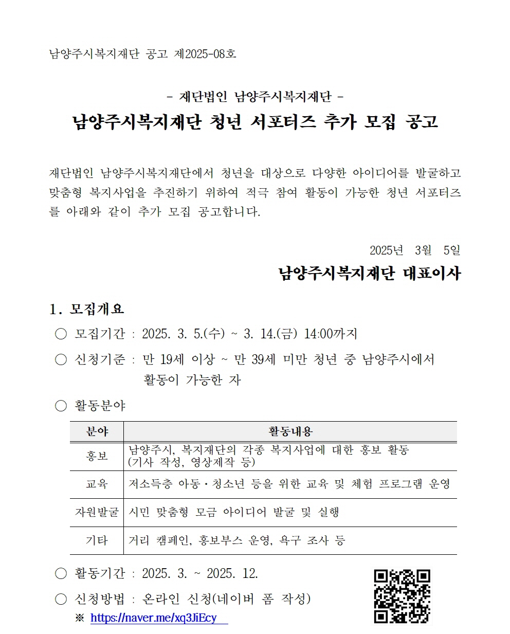 공지 2025년 남양주시복지재단 청년서포터즈 추가 모집 공고