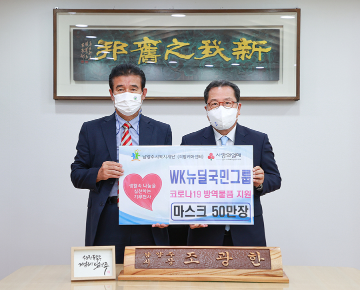 WK뉴딜국민그룹(총재 박항진)은 24일 남양주시 관내 코로나19 취약계층을 위해 마스크 50만장을 남양주시복지재단(대표이사 우상현)에 기부했다.