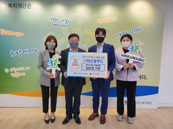 이에 남양주시복지재단 심우만 대표이사는 “도움의 손길이 필요한 지역 어르신들을 위해 따뜻한 나눔을 실천해 주신 ㈜따순둥푸드 신기수 대표님께 감사드린다”며 “후원 물품은 꼭 필요한 곳에 전달될 수 있도록 힘쓰겠다”고 감사의 뜻을 전했다.