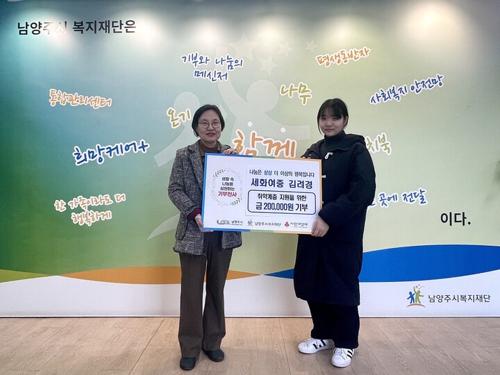 세화여자중학교 3학년 김려경 학생은 지난 1월 24일 ‘제2회 미래청소년 과학오디션’에서 우수상을 수상하며 받은 상금 20만원 전액을 남양주시복지재단(대표이사 원병일)에 기부했다.