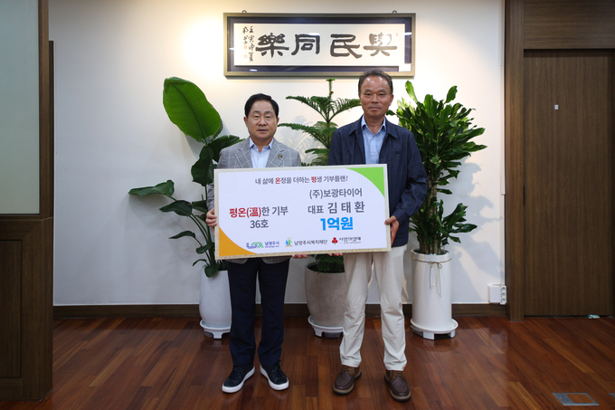 남양주시가 ㈜보광타이어를 '평온한 기부' 36호 회원으로 새롭게 맞이하며 지역사회 나눔 문화 확산에 힘을 더했다. ㈜보광타이어는 지속적인 기부 활동을 통해 사회적 책임을 다하고 지역과 함께 성장하겠다는 의지를 공식화했다.