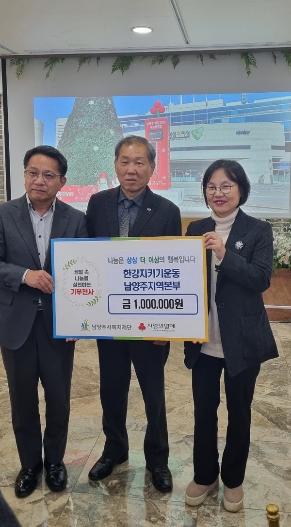 남양주시(시장 주광덕)는 (사)한강지키기운동 남양주지역본부(대표 남궁완)가 지난 8일 화도읍 오월뷔페에서 진행한 ‘2023년 정기총회 및 환경인의 밤’행사에서 후원금 100만원을 남양주시복지재단(대표이사 심우만)에 전달했다고 12일 밝혔다.