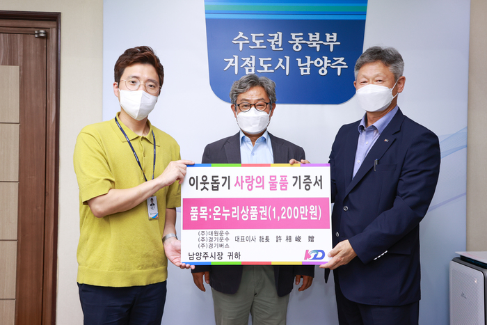 이날 전달식에는 박신환 남양주시 부시장, 곽두영 KD운송그룹 상무이사, 남양주시복지재단 김윤기 나눔지원팀장 등 관계자들이 참석했으며, KD운송그룹이 기부한 온누리상품권은 남양주시복지재단을 통해 관내 취약계층에게 전달될 계획이다.