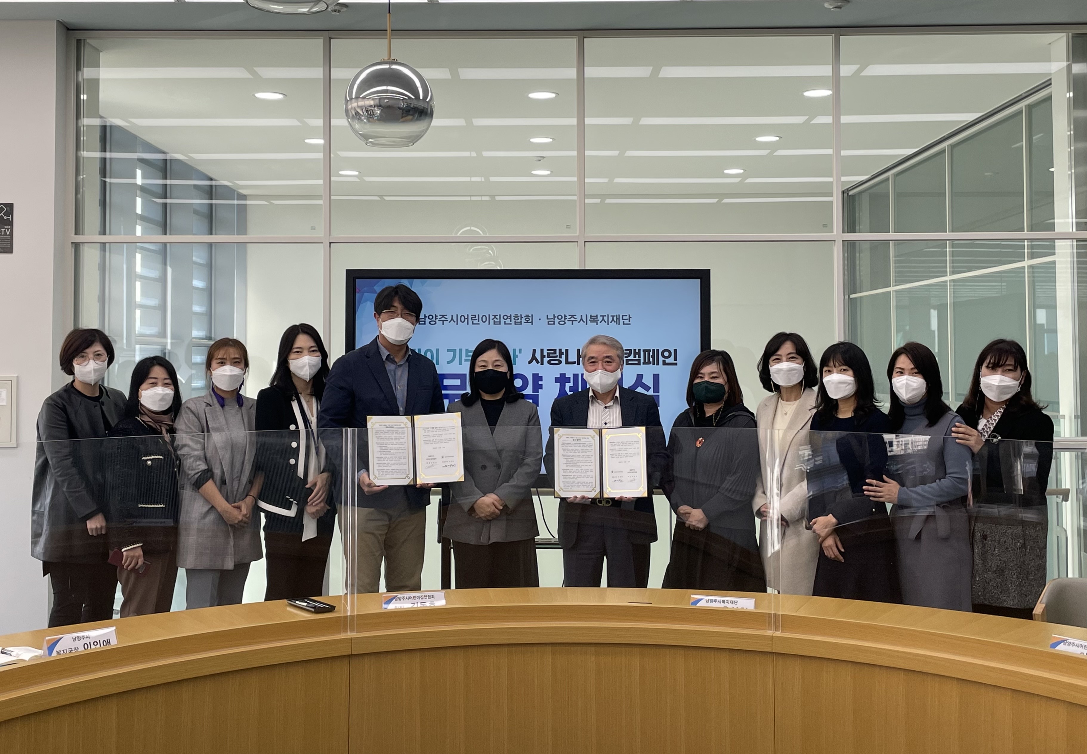 남양주시복지재단-남양주시어린이집연합회 '어린이 기부천사 사랑 나누기 캠페인’ MOU 체결 | [연번] : 정보가 없습니다. | [일자] : 2021.11.16. 작성자 관리자 등록일자 2021년 11월 16일 21시 58분 56초 조회 532 2021. 11. 16. 남양주시어린이집연합회와 '어린이 기부천사 사랑 나누기 캠페인’을 위한 MOU를 체결했습니다. 재단·어린이집연합회 MOU 체결식(1).jpg [ Size : 1.14MB, Down : 656 ] 미리보기 다운로드 재단·어린이집연합회 MOU 체결식(6).jpg [ Size : 1.41MB, Down : 261 ] 미리보기 다운로드 재단·어린이집연합회 MOU 체결식(7).jpg [ Size : 1.15MB, Down : 269 ] 미리보기 다운로드 목록보기