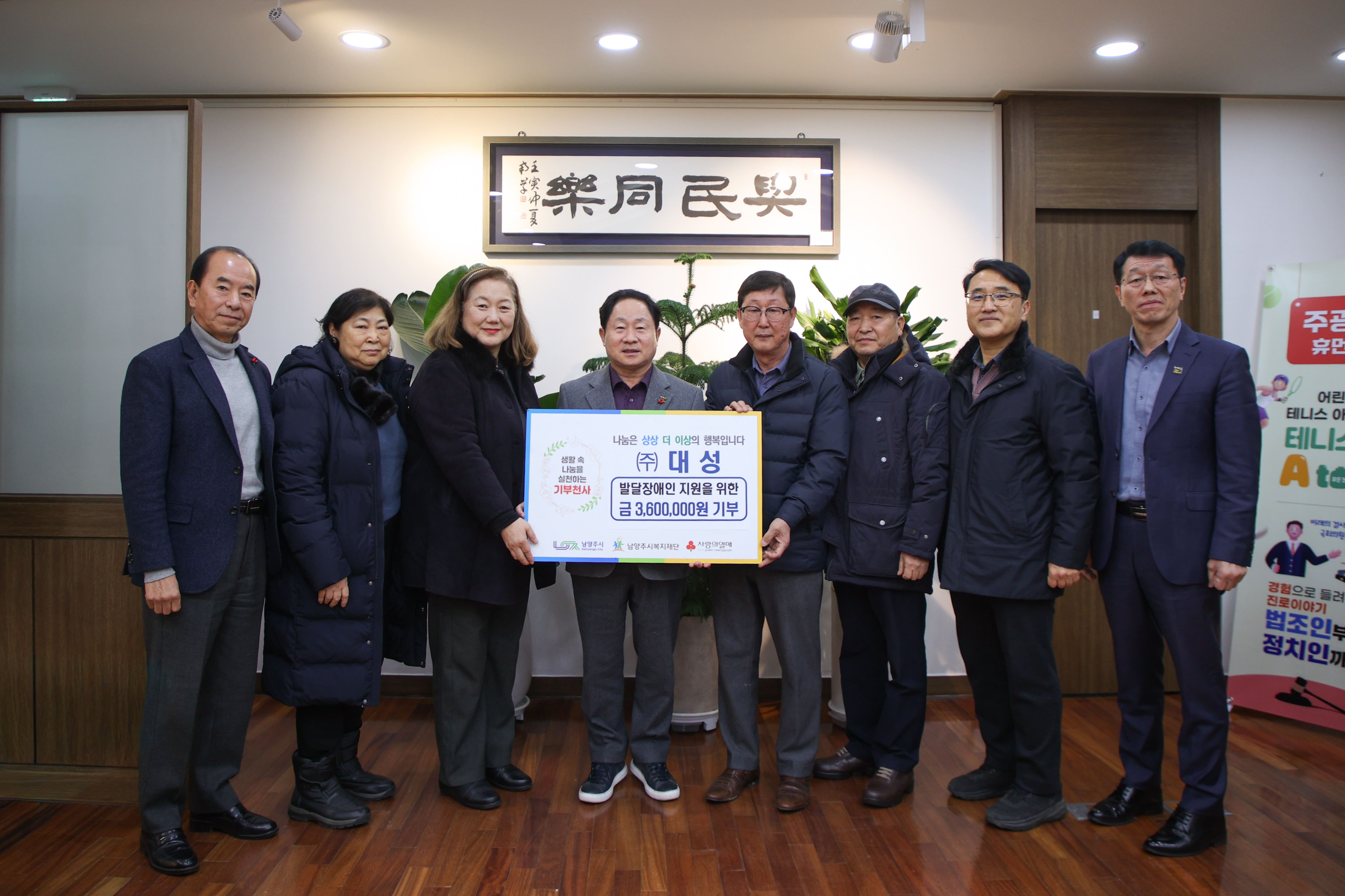 1월 23일 ㈜대성(대표 이만우)에서 발달장애인을 위한 나눔을 4년째 이어오며, 올해도 후원금 360만 원을 기부해주셨습니다.