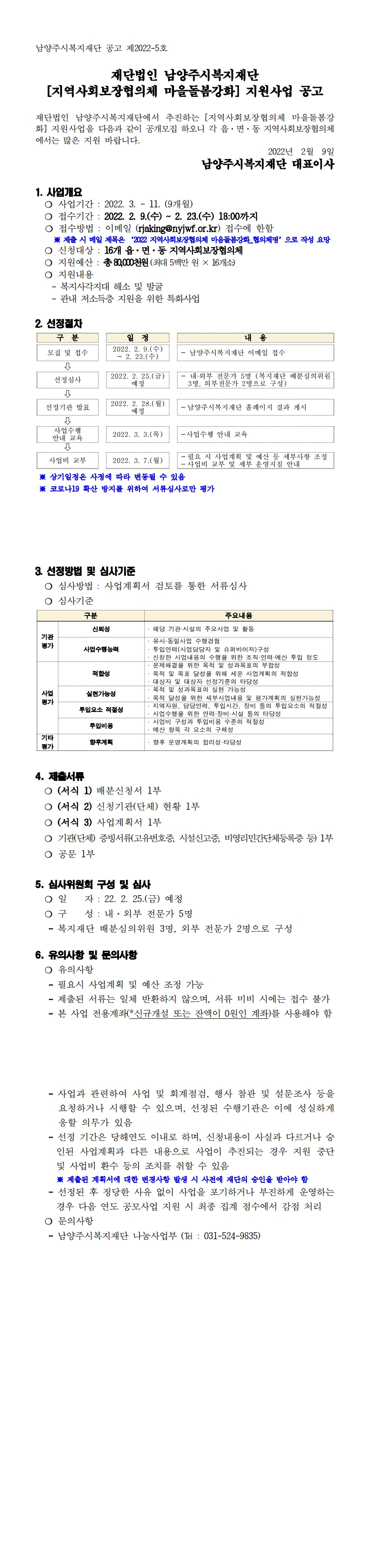 공모사업 2022 남양주시복지재단 [지역사회보장협의체 마음돌봄강화 지원] 사업 모집 공고 작성자 관리자 등록일자 2022년 2월 9일 13시 35분 28초 조회 826 2022 남양주시복지재단 [지역사회보장협의체 마음돌봄강화 지원] 사업 모집 공고.png [ Size : 769.29KB, Down : 533 ] 미리보기 다운로드 서식1_신청서.hwp [ Size : 44.5KB, Down : 759 ] 다운로드 서식2_신청기관(단체)현황.hwp [ Size : 45.5KB, Down : 742 ] 다운로드 서식3_사업계획서.hwp [ Size : 40KB, Down : 781 ] 다운로드 목록보기
