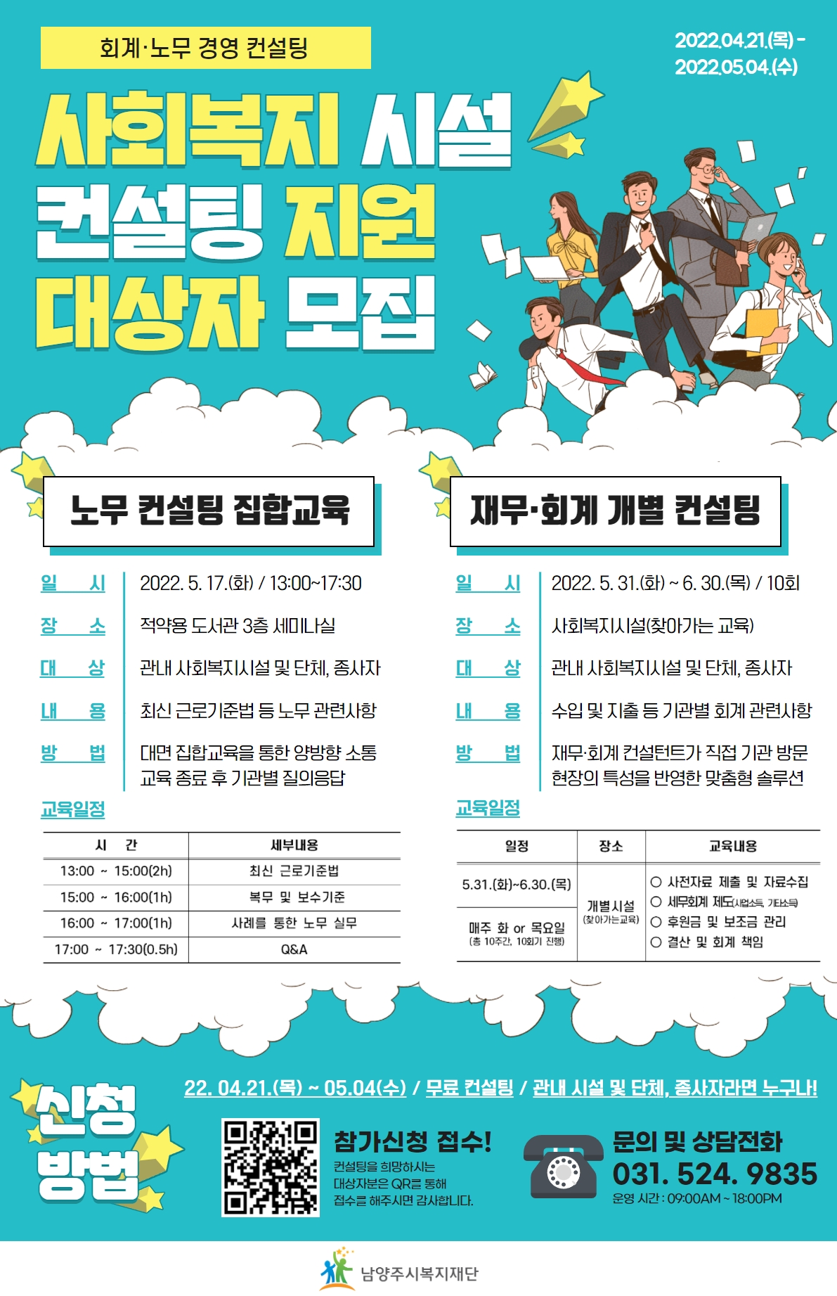 노무 및 재무회계와 관련된 전문적인 컨설팅이 필요한 기관의 많은 관심과 참여 부탁드립니다.