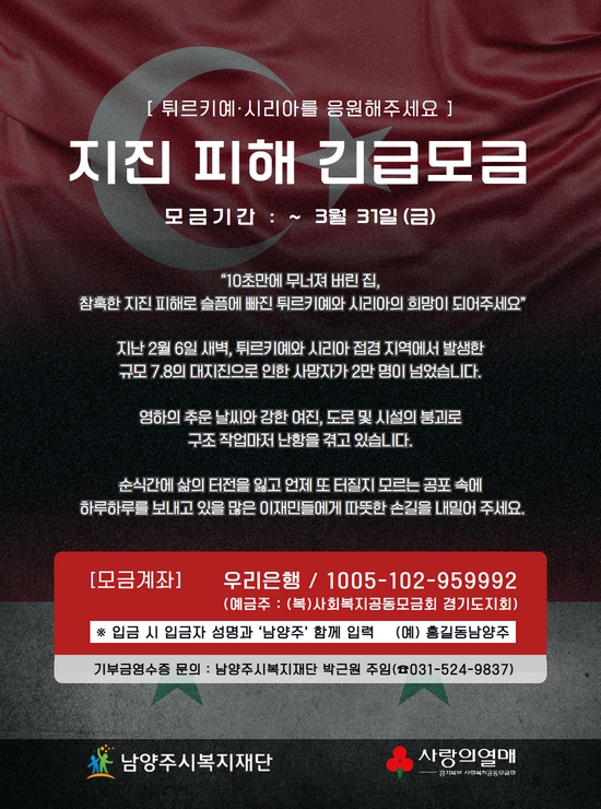 [모금기간] 2023. 2. 14.(화) ~ 3. 31.(금) [모금계좌] 우리은행 / 1005-102-959992 (예금주 : 사회복지공동모금회 경기도지회) ※ 입금 시, 성명과 함께 '남양주' 기재 (예. 홍길동남양주) [문 의] 남양주시복지재단 박근원 주임(☎031-524-9837)  |