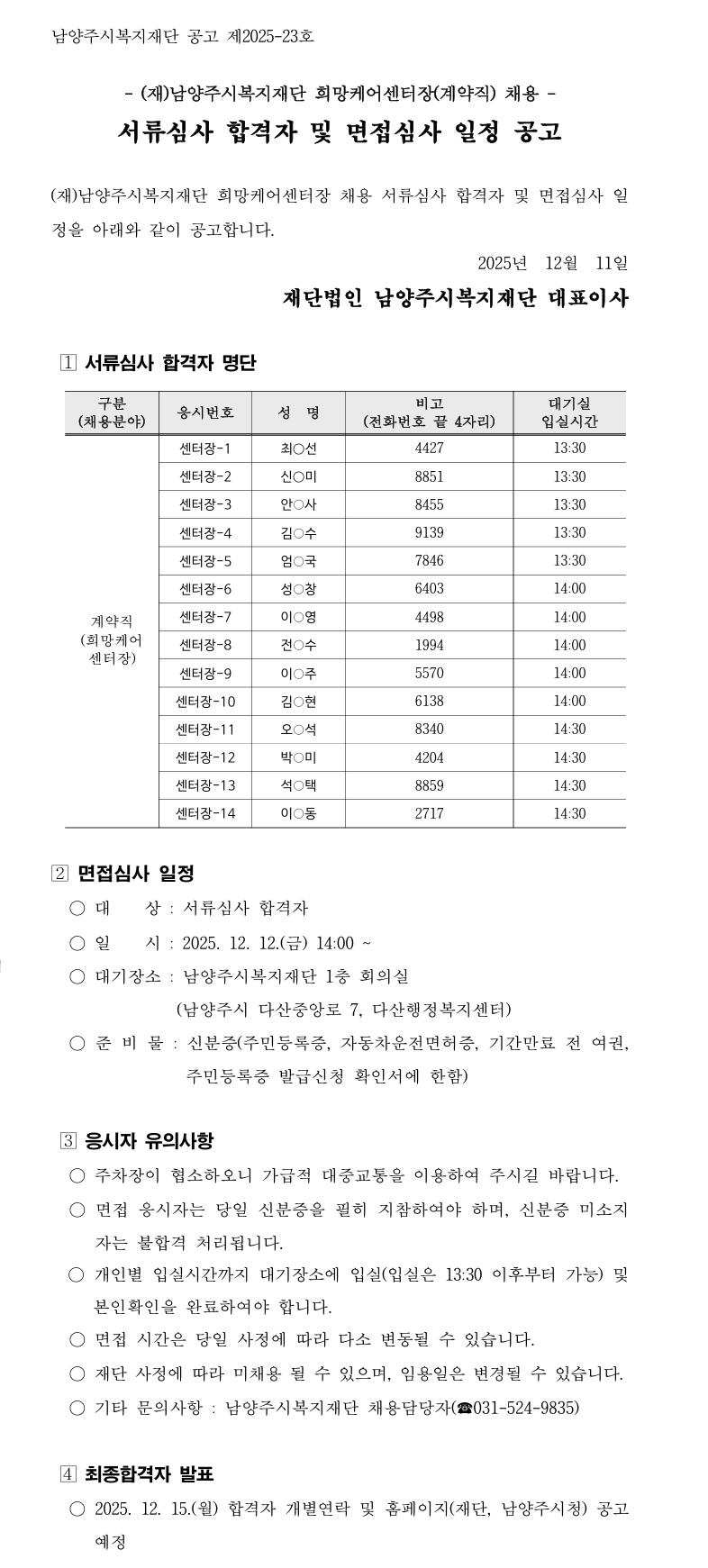 채용정보 (재)남양주시복지재단 희망케어센터장(계약직) 채용 서류심사 합격자 및 면접심사 일정 공고 작성자 관리자 등록일자 2025년 12월 10일 10시 24분 34초 조회 86 공고문.png [ Size : 203.2KB, Down : 151 ] 미리보기 다운로드 목록보기