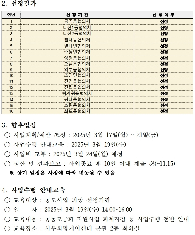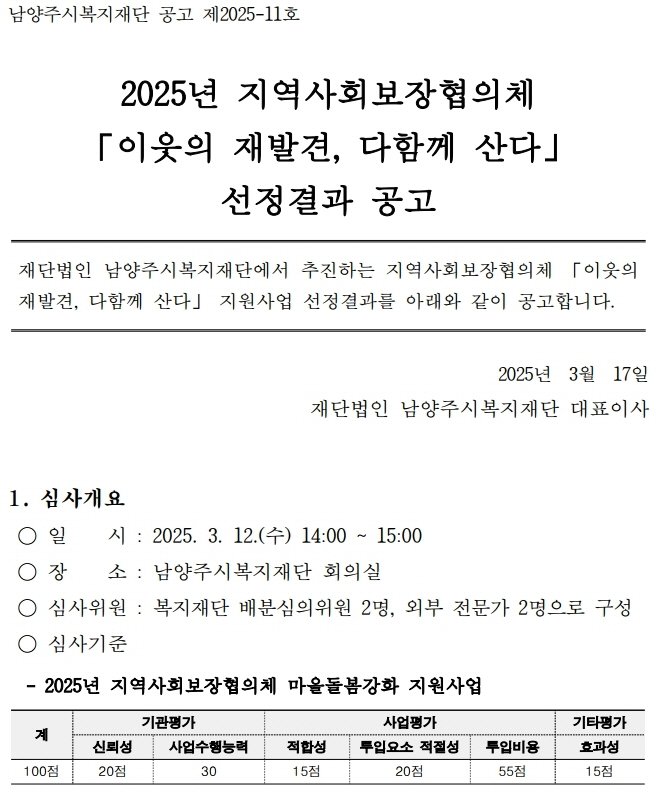 공모사업 2025년 지역사회보장협의체 지원사업 선정결과 공고 작성자 관리자 등록일자 2025년 3월 17일 15시 19분 19초 조회 414 1.jpg [ Size : 255.62KB, Down : 283 ] 미리보기 다운로드 2.jpg [ Size : 351.64KB, Down : 286 ] 미리보기 다운로드 3.jpg [ Size : 150.66KB, Down : 280 ] 미리보기 다운로드 목록보기