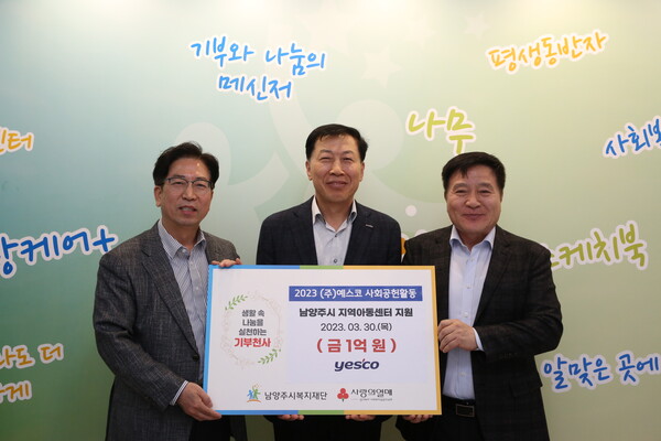 예스코(대표이사 정창시)는 지난 3월 30일, 남양주시청 및 남양주시복지재단 관계자 10여명이 참석한 가운데, 사회공헌활동 일환으로 남양주시 지역아동센터에 1억원을 지원하는 협약식 및 전달식을 시행했다.