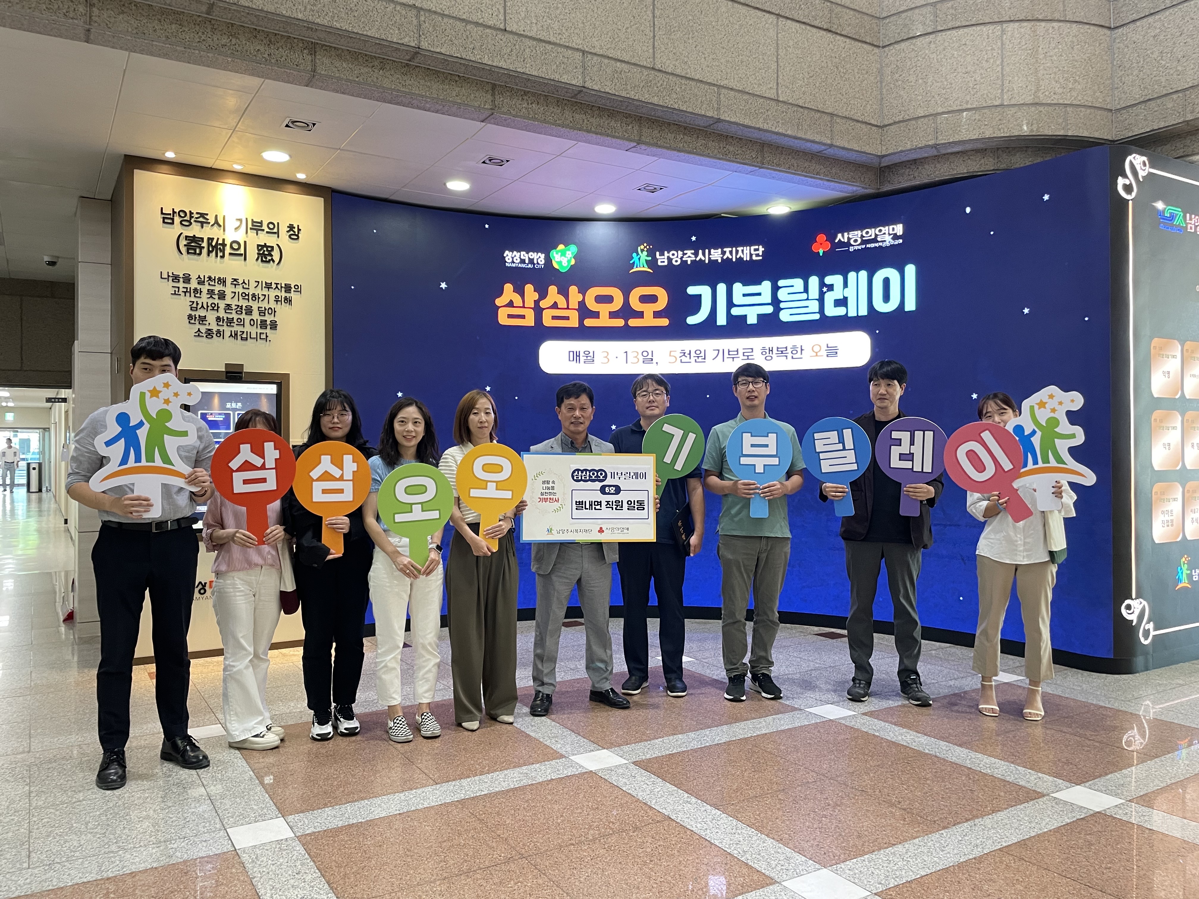 남양주시 각 부서와 관내 사회단체가 함께하는 삼삼오오 기부릴레이에 별내면주민센터 직원들이 동참했습니다.