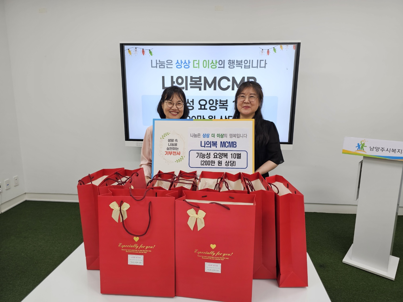 남양주시 오남읍에 소재한 나의복 MCMB는 지난 21일 지역 내 도움이 필요한 이웃을 위해 200만 원 상당의 기능성 요양복 10벌을 남양주시복지재단(대표이사 심우만)에 전달했다.