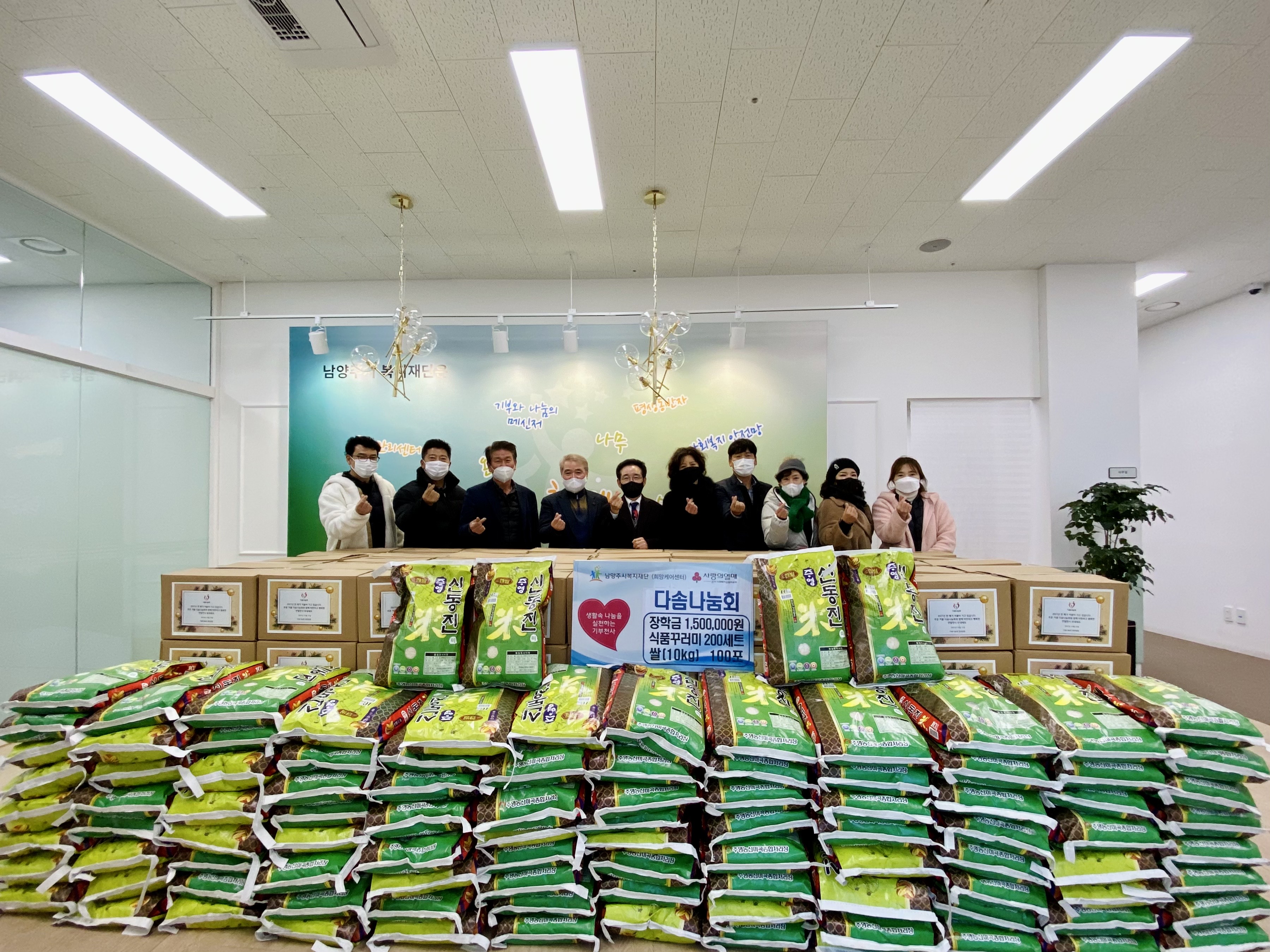 남양주시복지재단은 지난 17일 다솜나눔회로부터 식료품꾸러미 200세트 및 쌀 100포(10kg)와 저소득 아동․청소년 장학금 지원을 위한 150만 원을 전달받았다고 밝혔다.