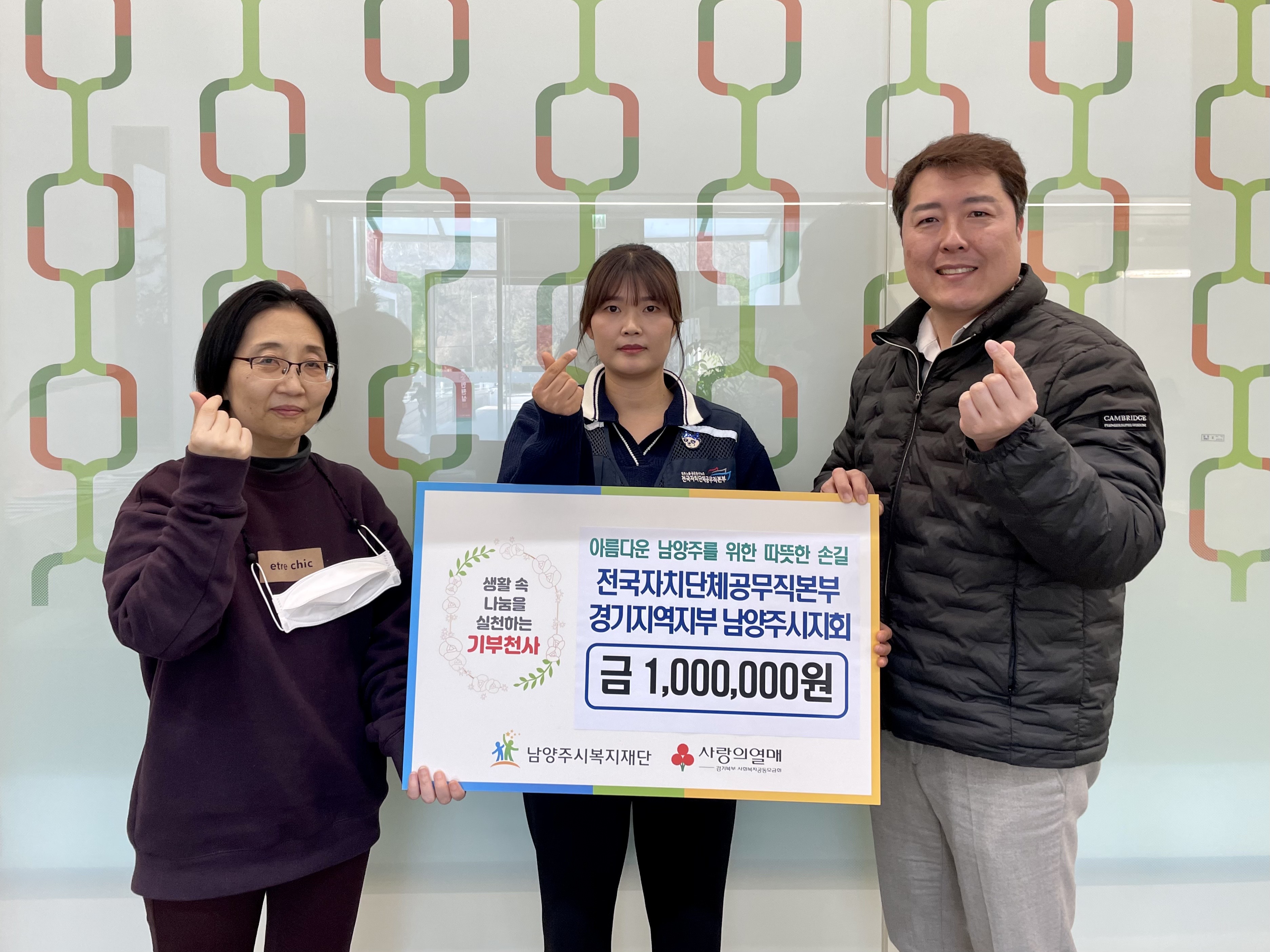 출처 : 전국자치단체공무직본부 경기지역지부 남양주시지회, 남양주시복지재단에 1백만 원 기부 < 사회·경제 < 뉴스 < 기사본문 - 뉴스Q (newsq.kr)