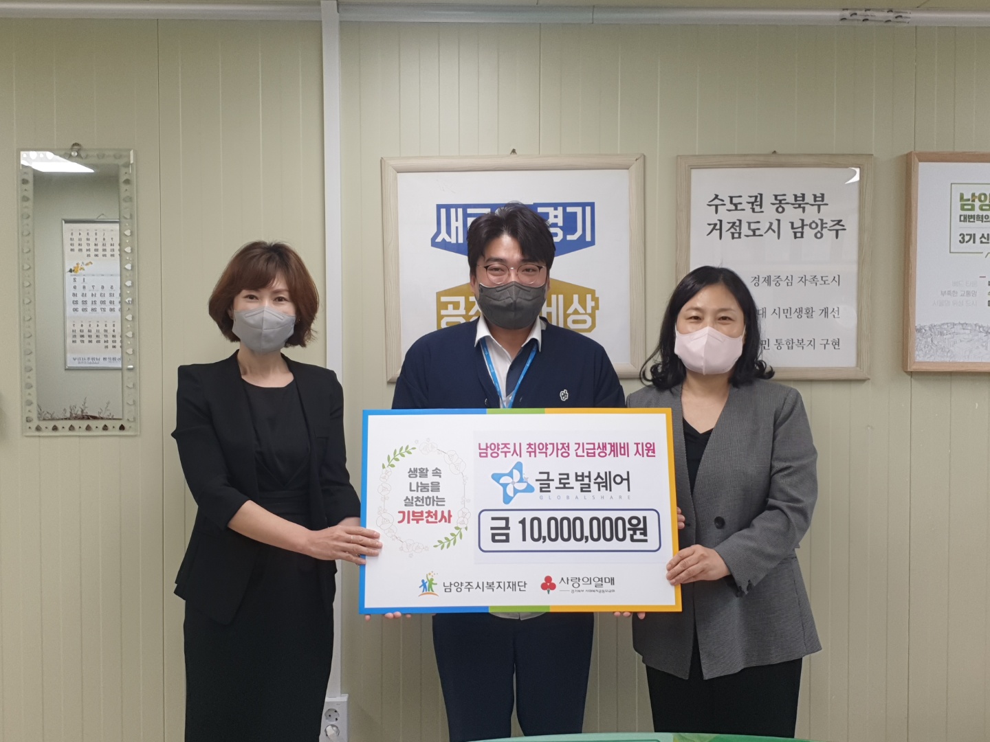 ㈔글로벌쉐어(대표이사 고성훈)는 29일 남양주시 소외계층 생계비 지원을 위해 남양주시복지재단(대표이사 우상현)을 통해 1,000만 원을 전달했다고 밝혔다.