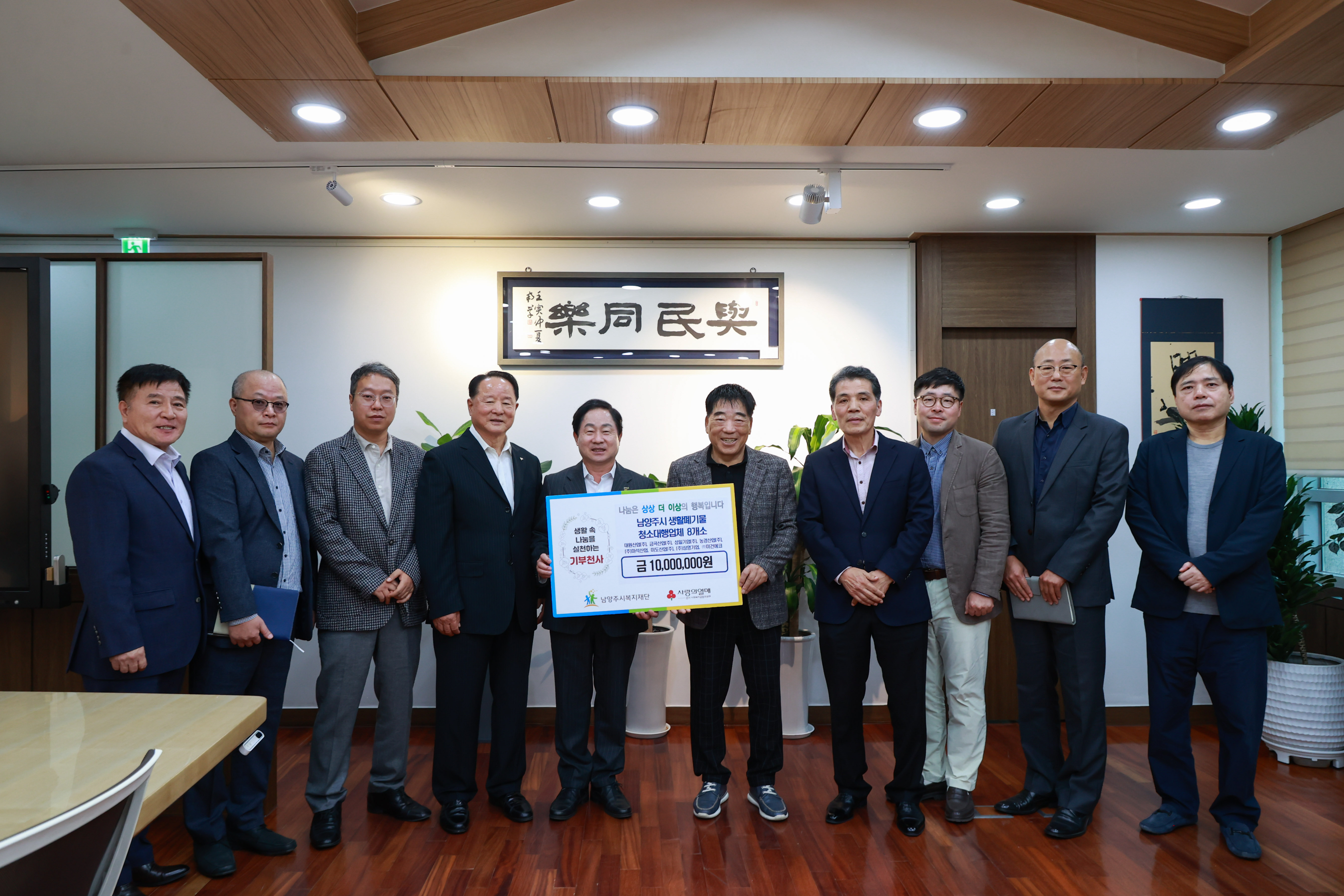 남양주시 생활폐기물 수집·운반 8개 대행업체는 23일 시장집무실에서 관내 취약계층 지원을 위한 지역사회 나눔 실천 후원금 1,000만 원을 남양주시복지재단(대표이사 심우만)에 전달했다.