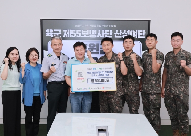[미디어투데이=안상일기자] 육군 제55보병사단 산성여단 구리·남양주대대 장병들은 지난 26일 남양주시 취약계층 가정을 위한 기부금 60만 원을 남양주시복지재단(대표이사 심우만)에 전달했다.