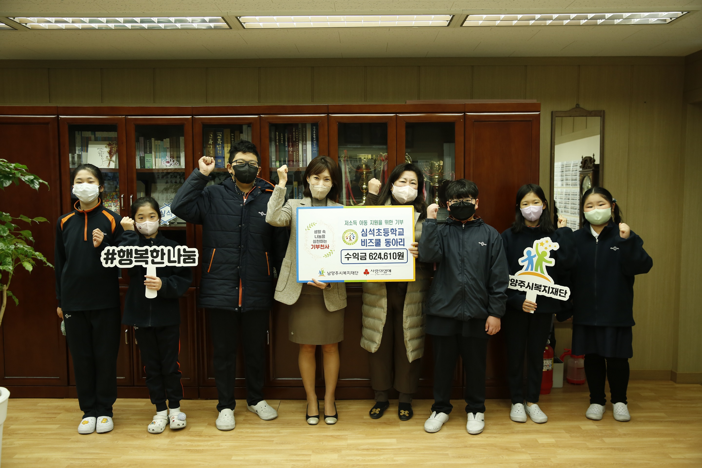 남양주시복지재단(대표이사 심우만)은 지난 9일 심석초등학교 비즈쿨 동아리 학생들이 연말연시를 맞아 지역의 어려운 이웃을 돕기 위해 물품 판매 수익금 624,610원을 전액 기부했다고 13일 밝혔다.