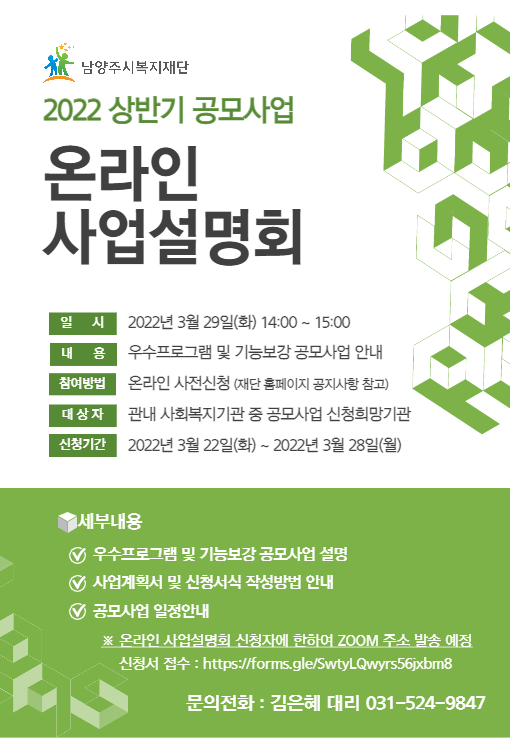 남양주시복지재단, '2022년 상반기 공모사업 온라인 사업설명회' 신청 안내(2022.03.28.)