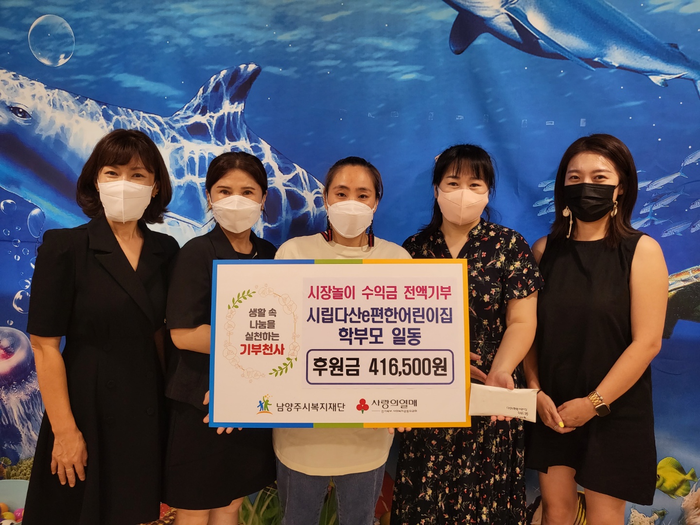 남양주시복지재단(대표이사 우상현)은 지난 19일 시립다산e편한어린이집(원장 강미영)에서 어린이집 원생들과 부모, 교사들이 함께 참여한 ‘시장놀이’ 행사의 수익금 416,500원을 전액 기부했다고 밝혔다.