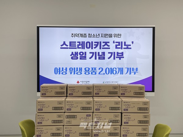 남양주시(시장 주광덕)는 아이돌 스트레이키즈의 팬이 멤버 ‘리노’의 생일(10월 25일)을 기념해 여성용품 2,016개를 남양주시복지재단(대표이사 원병일)에 기부했다고 28일 밝혔다.