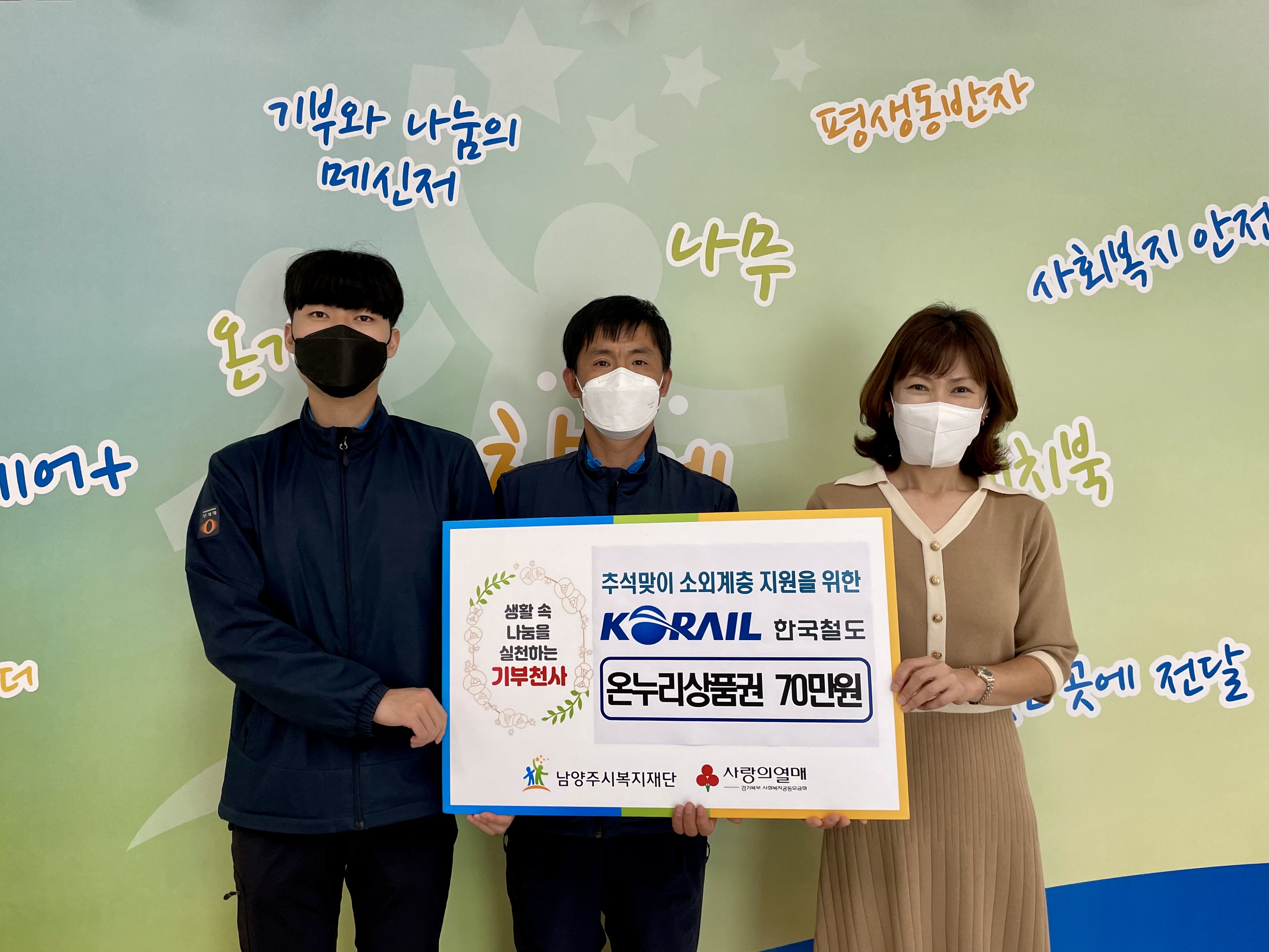 한국철도공사는 지난 6일 추석맞이 소외계층 생활 지원을 위한 온누리상품권 70만원을 남양주시복지재단에 전달했다.