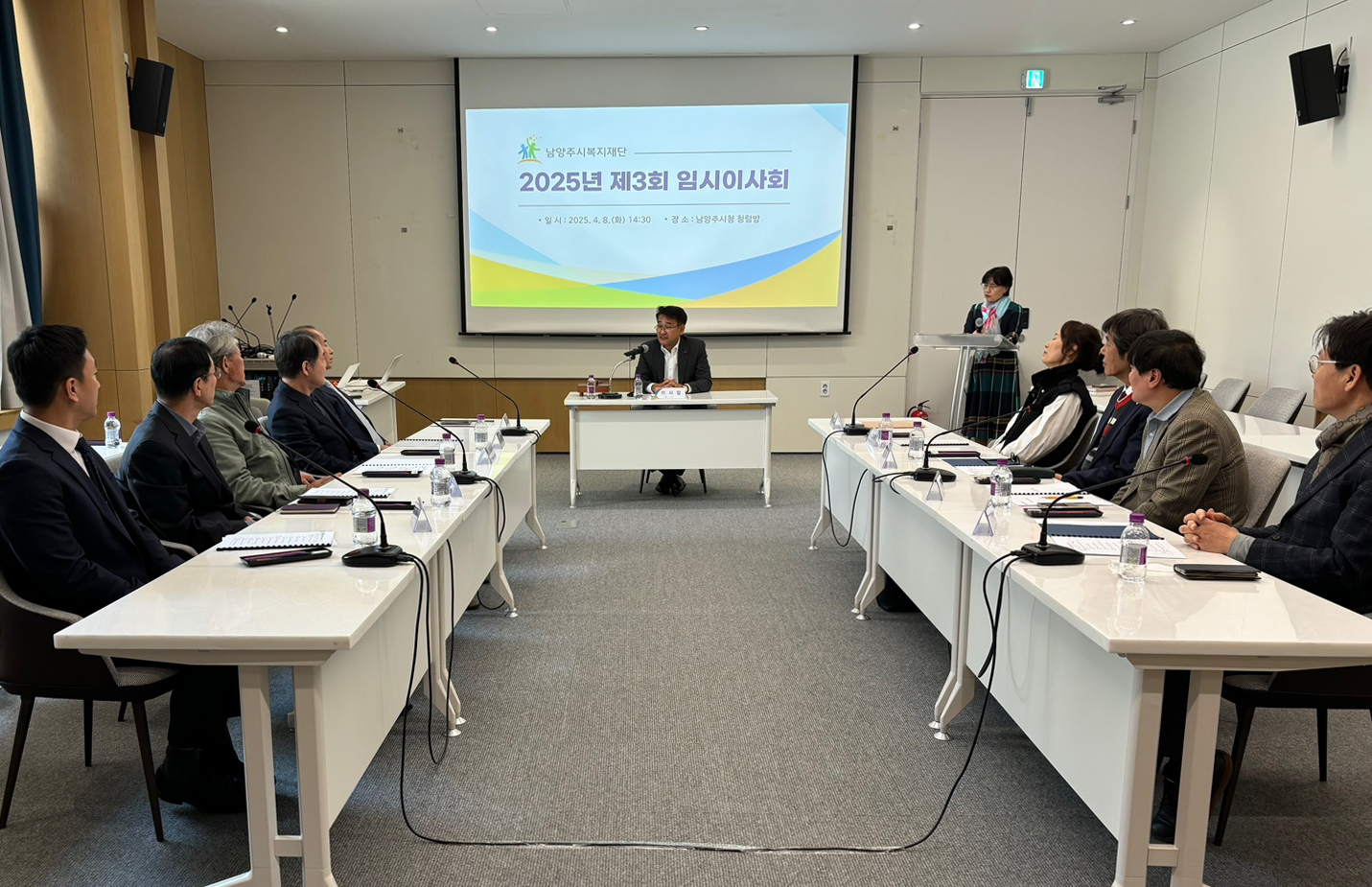 임원 임명식 및 2025년 제3회 임시이사회 | [연번] : | [일자] : 25.04.08.(화) 작성자 관리자 등록일자 2025년 4월 8일 19시 46분 18초 조회 297 2025년 4월 8일 (화) 남양주시청 청렴방에서 임원 임명식 및 제3회 임시이사회를 개최하였습니다.이날 이사회에서는 남양주시복지재단 이사장 선출(안)을 심의하였으며, 장근환 이사님께 제4대 이사장으로 선출되셨습니다. 03F7A1E9-5B0A-B998-5B2C-1B49259316D0.JPG [ Size : 1.85MB, Down : 145 ] 미리보기 다운로드 250408.png [ Size : 1.54MB, Down : 147 ] 미리보기 다운로드 목록보기