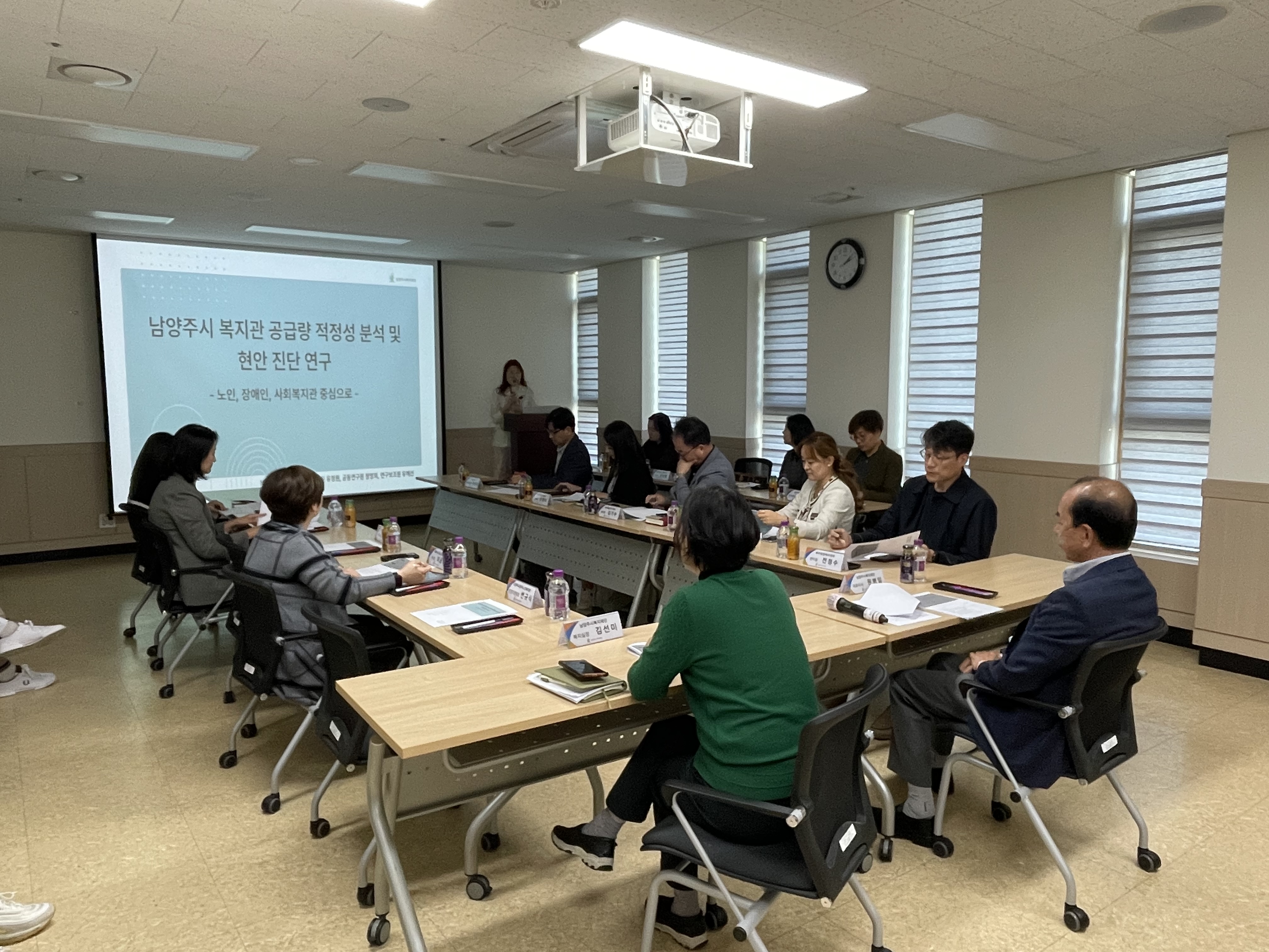 사회복지 정책연구 중간보고회(복지시설 현안진단 연구) | [연번] : | [일자] : 2024.10.23.(수) 작성자 관리자 등록일자 2024년 10월 28일 15시 6분 9초 조회 342 2024년 10월 23일(수) 오후 2시 다산행정복지센터 소회의실에서 2024년 남양주시복지재단 사회복지 정책연구 중 「남양주시 사회복지관 공급량 적정성 및 현안진단 연구」의 중간보고회를 실시하였습니다.남양주시 내 노인·장애인·종합복지관 관계자 및 담당 공무원 등 민관을 아우르는 복지 전문가들이 모여연구진행 현황에 대해 질의응답 및 수정‧보완사항을 논의하는 시간을 가졌습니다.이 날 공유된 의견들을 토대로 실효성 있는 연구가 되도록 노력하겠습니다. 2024-10-23 복지관 현안진단 연구 중간보고회 1.jpg [ Size : 3.27MB, Down : 153 ] 미리보기 다운로드 2024-10-23 복지관 현안진단 연구 중간보고회 2.jpg [ Size : 3.59MB, Down : 157 ] 미리보기 다운로드 목록보기