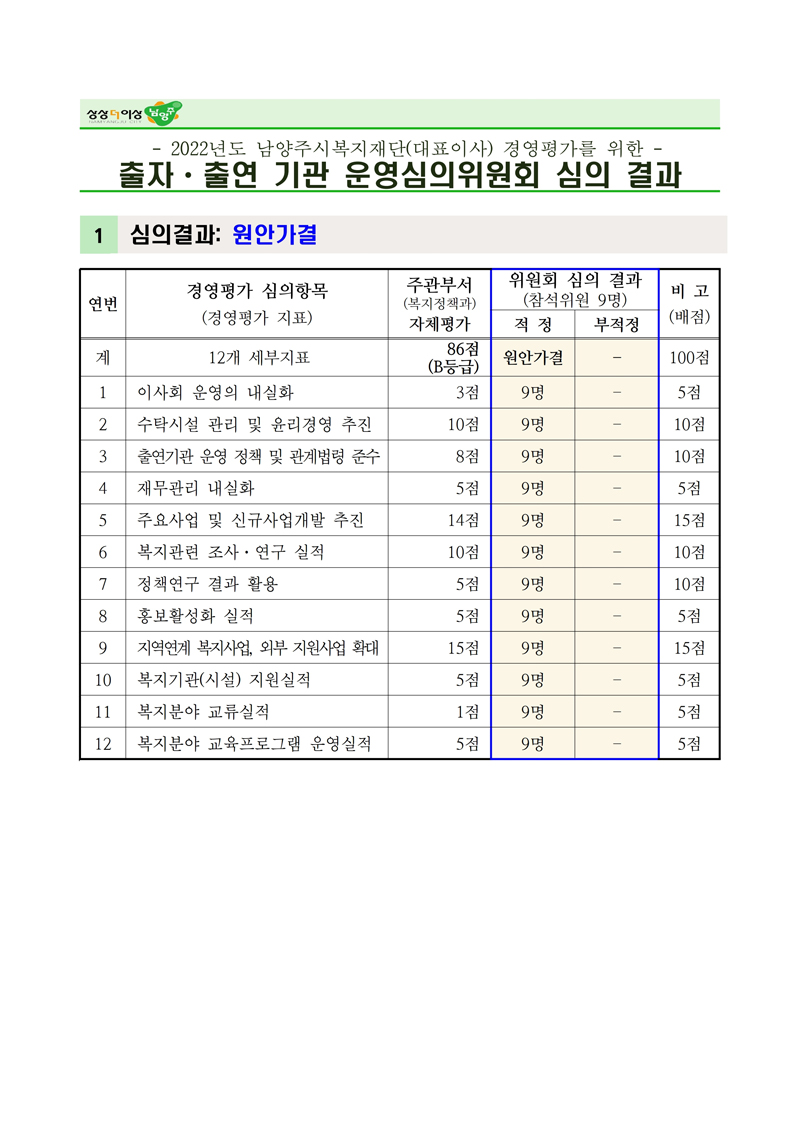 경영실적평가 2023년 남양주시복지재단 경영평가 결과