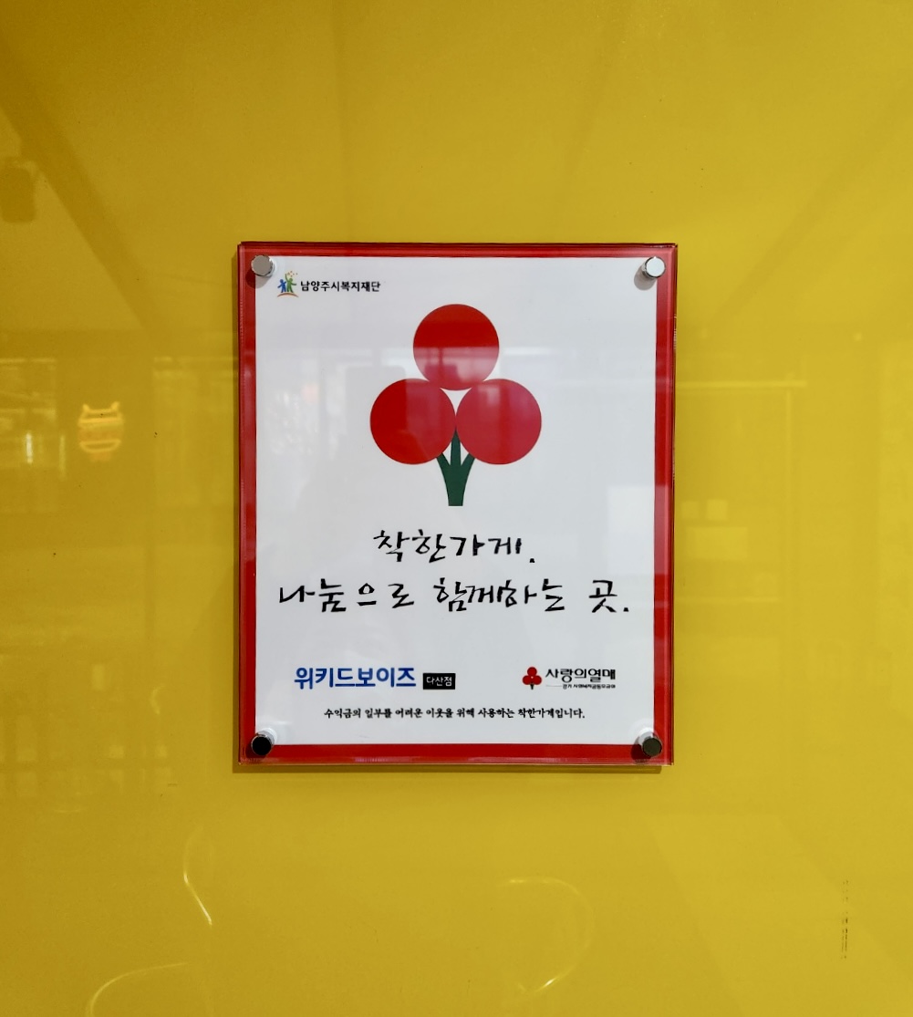 착한기부 [착한가게] 위키드보이즈 다산점 | [연번] : | [일자] : 2022년 11월 작성자 관리자 등록일자 2023년 1월 4일 16시 30분 34초 조회 521 ▷ 남양주시복지재단 착한가게 10호 위키드보이즈 다산점 (다산동 소재) ※ '착한가게'란? 월 3만원 이상의 금액을 기부하며 지역사회와 상생하는 가게 위키드보이즈 다산점 착한가게 현판 부착사진.jpg [ Size : 2.08MB, Down : 211 ] 미리보기 다운로드 위키드보이즈 다산점 착한가게 현판 부착사진1.jpg [ Size : 155.21KB, Down : 213 ] 미리보기 다운로드 목록보기