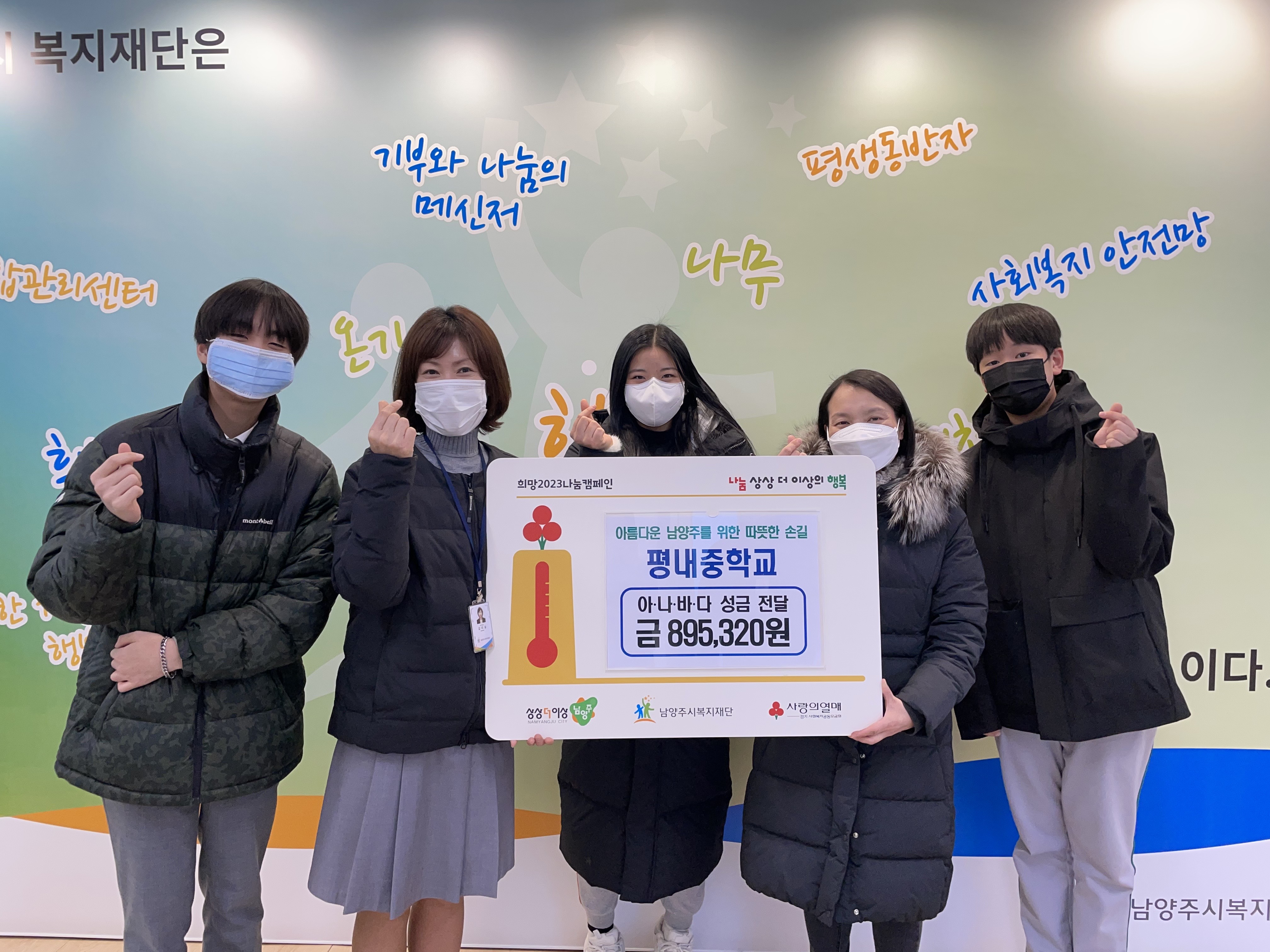 평내중학교 | [연번] : 정보가 없습니다. | [일자] : 2023.01.02. 작성자 관리자 등록일자 2023년 1월 28일 13시 31분 16초 조회 477 ▷ 후원일자 : 2023년 1월 2일(월) ▷ 후원내용 : 아나바다 행사 수익금 895,320원 기부 2023-01-02 평내중학교 학생회 아나바다 수익금 전달식.jpg [ Size : 2.61MB, Down : 203 ] 미리보기 다운로드 목록보기