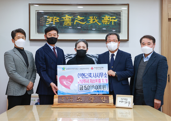 이현건축사사무소 | [연번] : 정보가 없습니다. | [일자] : 2022.01.17. 작성자 관리자 등록일자 2022년 1월 17일 21시 8분 13초 조회 383 ▷ 후원일자 : 2022년 1월 17일(월) ▷ 후원내용 : 취약계층 지원 위한 5,000,000원 기부 이현건축사사무소 전달식.jpg [ Size : 479.56KB, Down : 209 ] 미리보기 다운로드 목록보기
