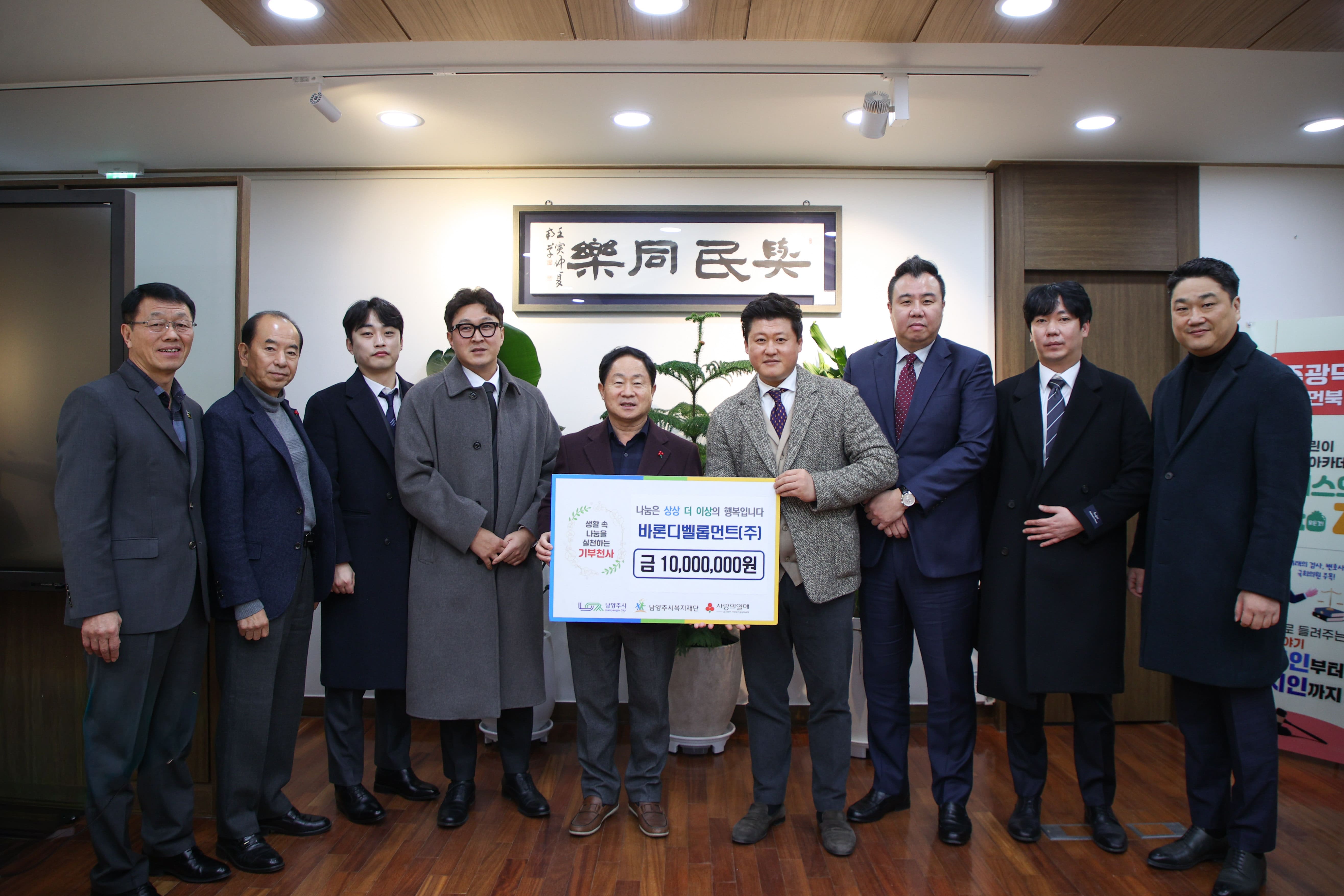 1월 5일 바론디벨롭먼트 주식회사(대표 이정우)가 지역 내 취약계층 지원을 위해 후원금 1천만 원을 기탁해주셨습니다.