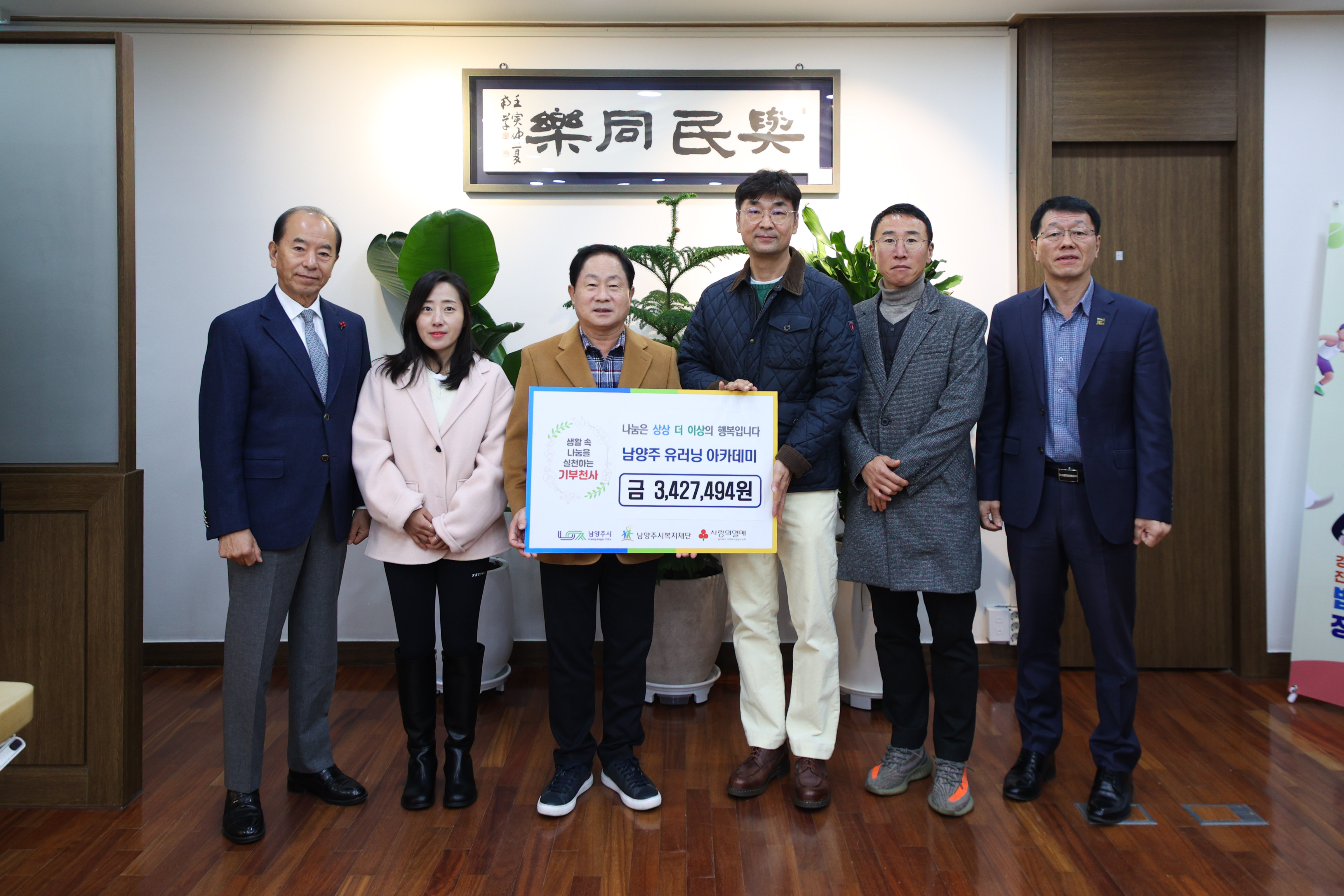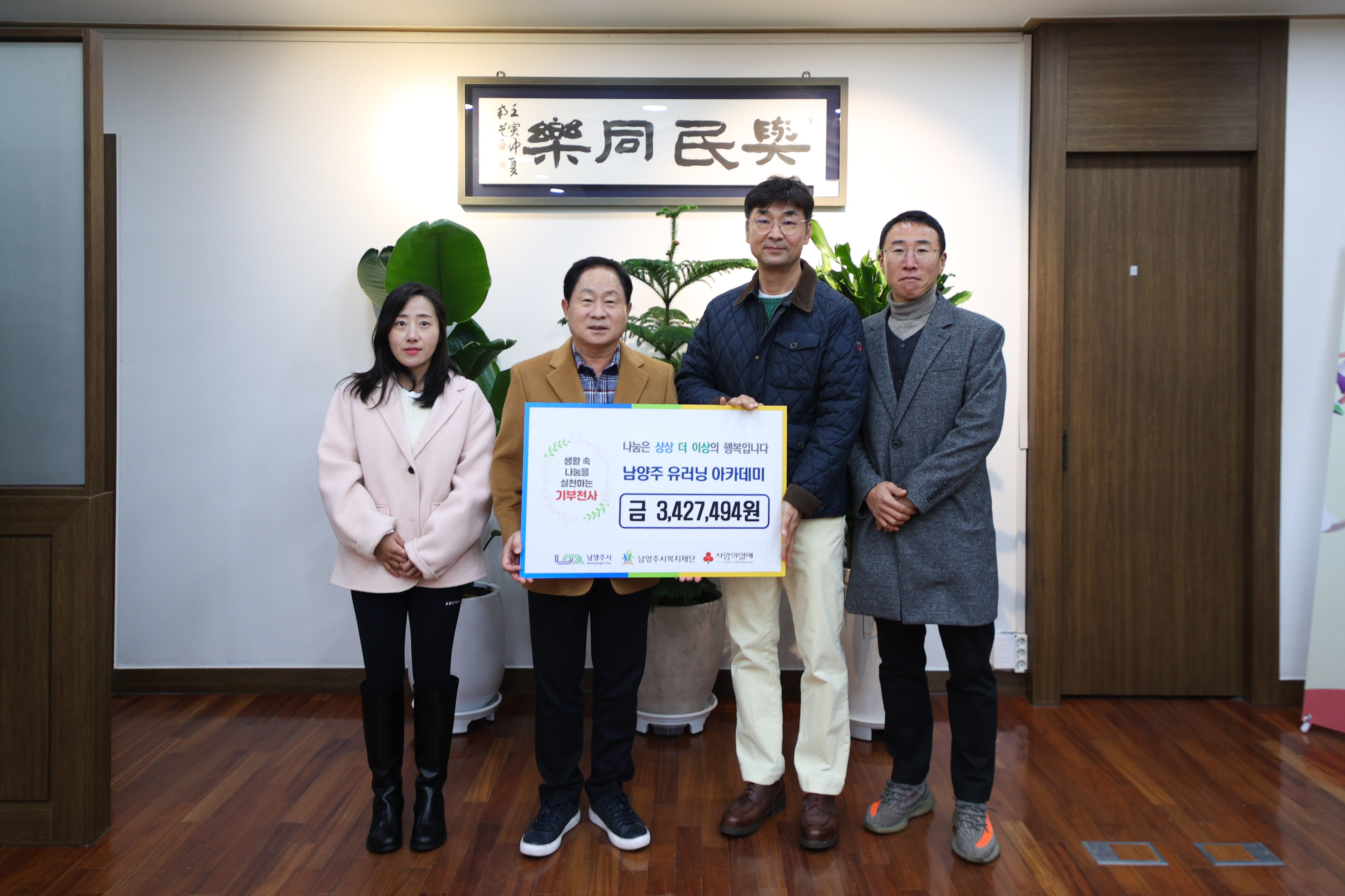 12월 3일 남양주시 유러닝 아카데미(감독 유진홍, 클럽장 정운채)에서 러닝 마일리지로 모은 후원금 3,427,494원을 남양주시복지재단에 전달해주셨습니다.