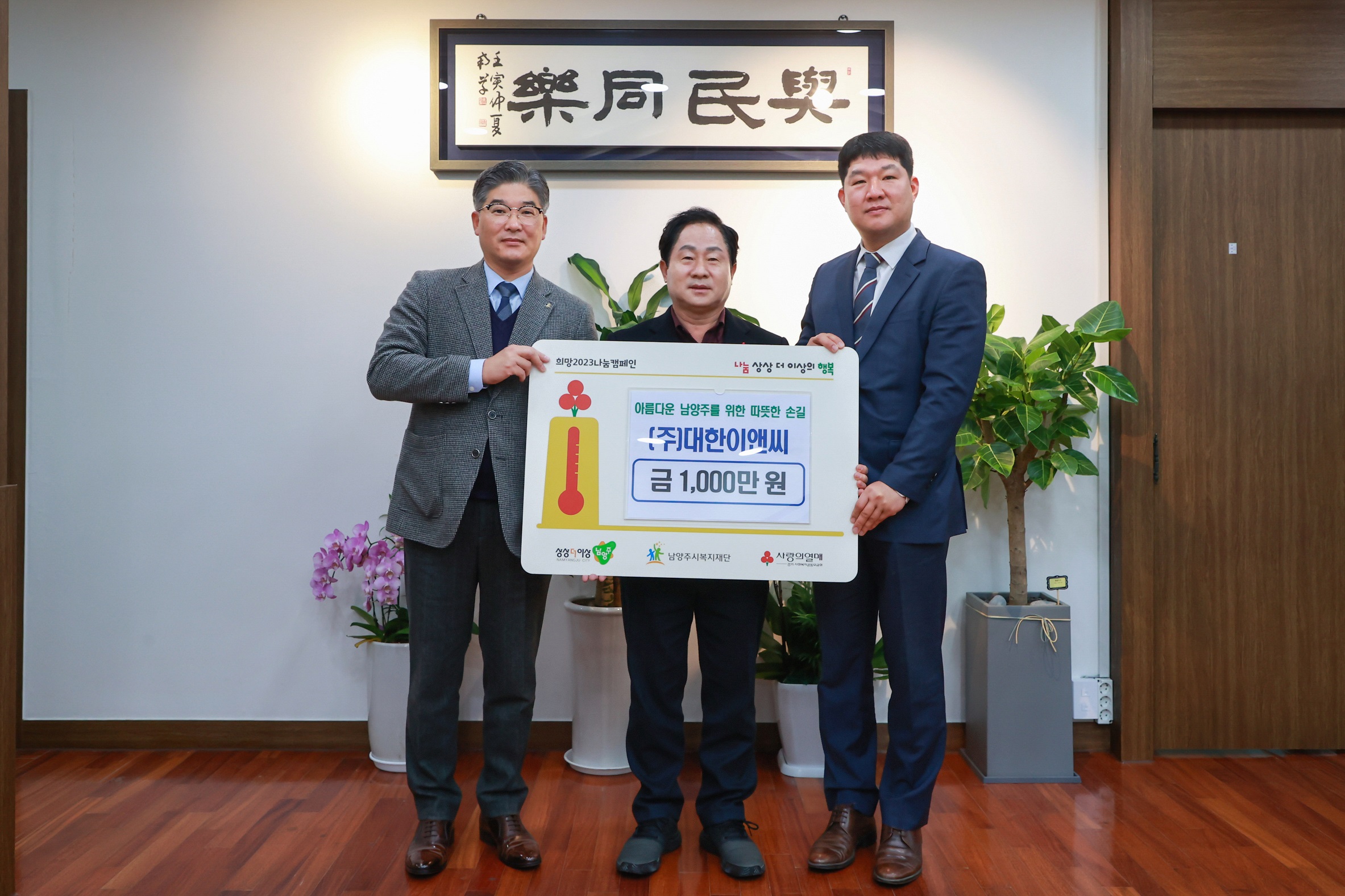 ㈜대한이앤씨 | [연번] : 정보가 없습니다. | [일자] : 2023.01.05. 작성자 관리자 등록일자 2023년 1월 28일 13시 40분 41초 조회 412 ▷ 후원일자 : 2023년 1월 5일(목) ▷ 후원내용 : 남양주시 취약계층 지원 1,000만원 기부 2023-01-05 (주)대한이앤씨 후원금 전달식.jpg [ Size : 836.09KB, Down : 210 ] 미리보기 다운로드 목록보기