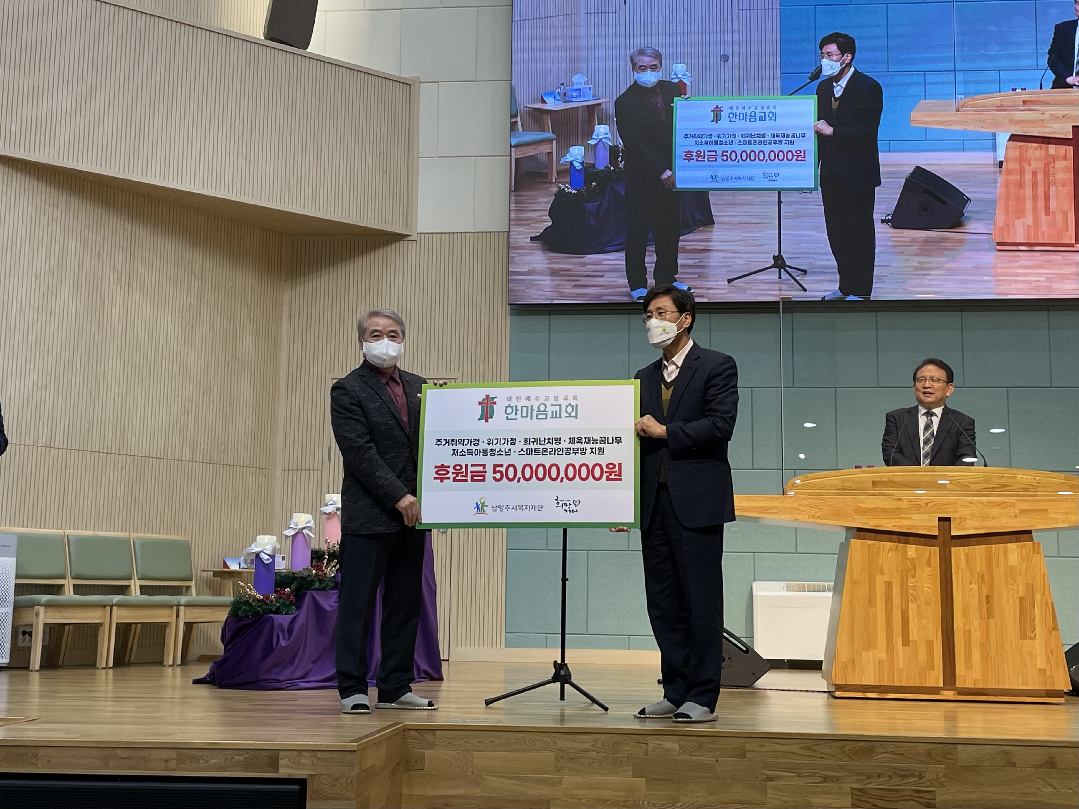 한마음교회 | [연번] : 정보가 없습니다. | [일자] : 2021.12.19. 작성자 관리자 등록일자 2021년 12월 22일 21시 24분 16초 조회 386 ▷ 후원일자 : 2021년 12월 19일(일)▷ 후원내용 : 취약계층 지원 위한 후원금 50,000,000원 - 주거취약·위기가정, 희귀난치병 환자, 체육 재능 꿈나무, 저소득 아동·청소년, 스마트 온라인 공부방 지원 한마음교회 전달식 1.jpg [ Size : 1.87MB, Down : 264 ] 미리보기 다운로드 목록보기