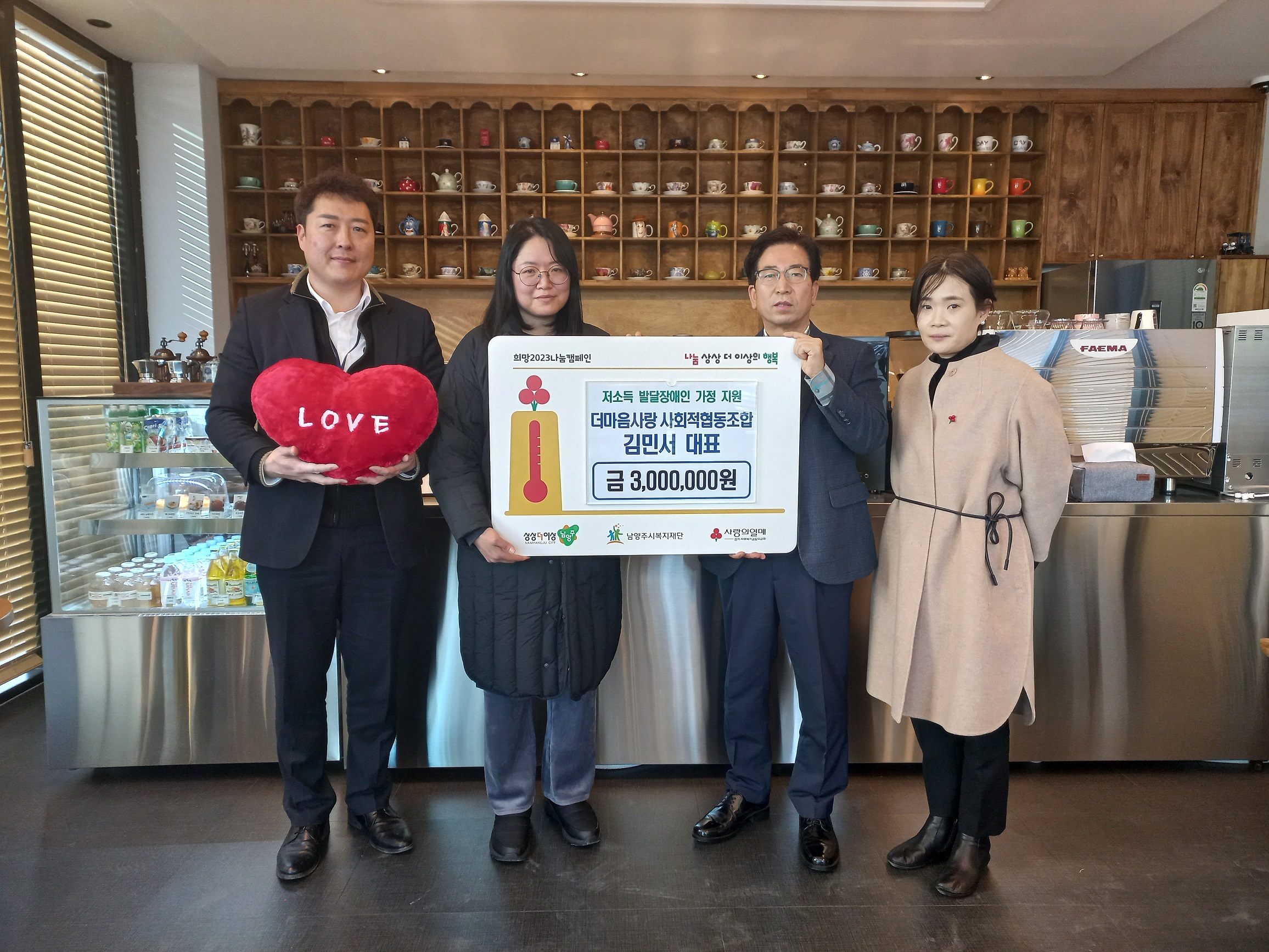 더마음사랑 사회적협동조합 | [연번] : 정보가 없습니다. | [일자] : 2022.12.14. 작성자 관리자 등록일자 2022년 12월 17일 12시 9분 38초 조회 467 ▷ 후원일자 : 2022년 12월 14일(수) ▷ 후원내용 : 발달장애인 가정 지원 위한 3백만원 기부 2022-12-14 더마음사랑 사회적협동조합 전달식.jpg [ Size : 2.31MB, Down : 264 ] 미리보기 다운로드 2022-12-14 더마음사랑 사회적협동조합 전달식 2.jpg [ Size : 1.21MB, Down : 247 ] 미리보기 다운로드 목록보기