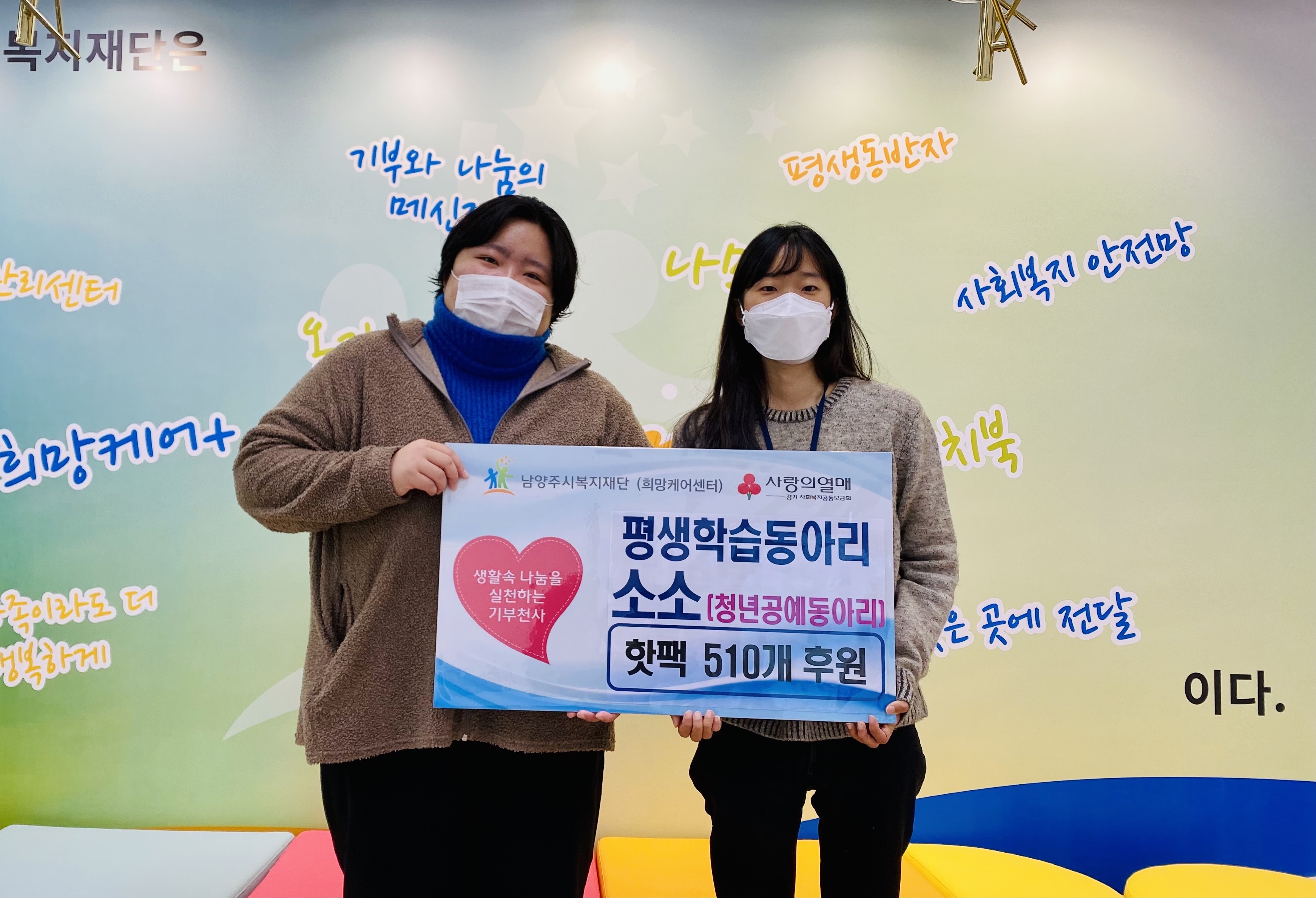 평생학습동아리 소소 | [연번] : 정보가 없습니다. | [일자] : 2021.11.09. 작성자 관리자 등록일자 2021년 11월 16일 22시 22분 25초 조회 554 - 후원일자 : 2021년 11월 9일(화)- 후원내용 : 핫팩 510개 소소(동아리) 전달식 사진.jpg [ Size : 1.72MB, Down : 315 ] 미리보기 다운로드 목록보기