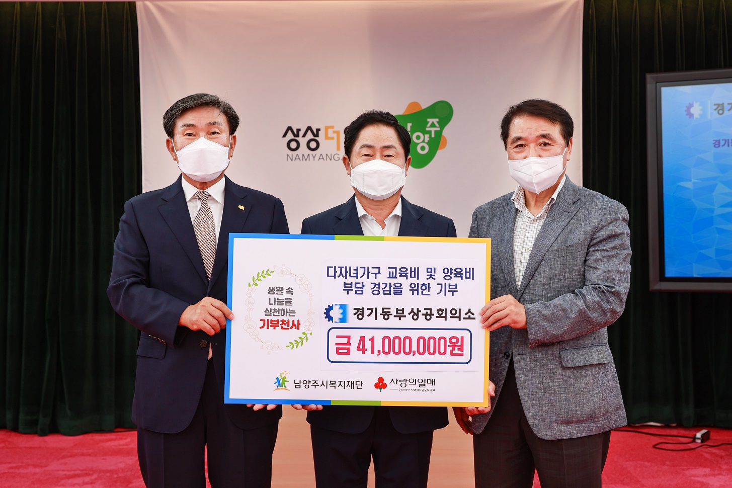 경기동부상공회의소 | [연번] : 정보가 없습니다. | [일자] : 2022.07.28. 작성자 관리자 등록일자 2022년 8월 6일 13시 48분 21초 조회 517 ▷ 후원일자 : 2022년 7월 28일(목) ▷ 후원내용 : 남양주시 다자녀가구 지원사업 지정 4,100만원 기부 2022-07-28 경기동부상공회의소 전달식 사진.jpg [ Size : 413.22KB, Down : 239 ] 미리보기 다운로드 2022-07-28 경기동부상공회의소 전달식 전체사진.jpg [ Size : 1.21MB, Down : 241 ] 미리보기 다운로드 목록보기