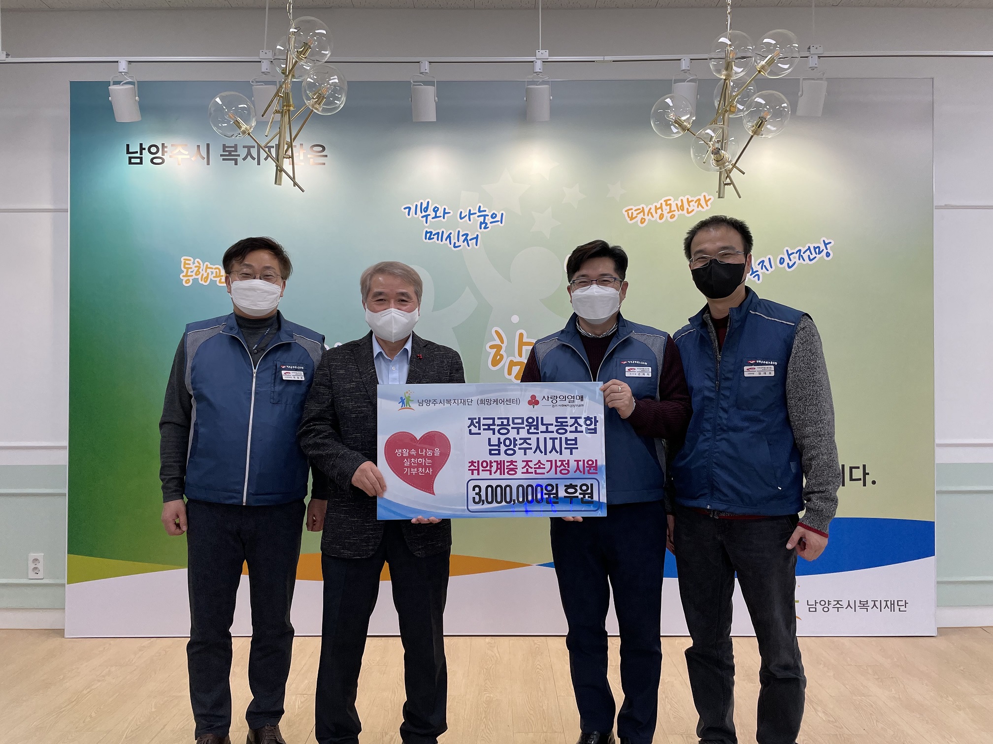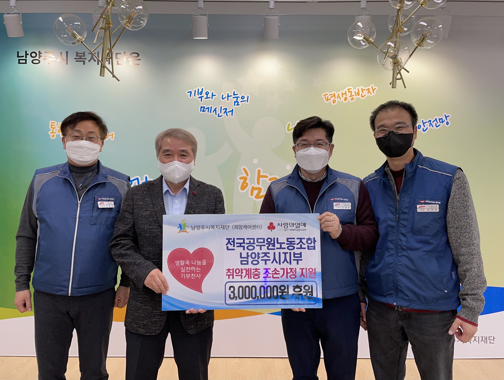 전국공무원노동조합 남양주시지부 | [연번] : 정보가 없습니다. | [일자] : 2021.12.21. 작성자 관리자 등록일자 2021년 12월 22일 21시 46분 14초 조회 447 ▷ 후원일자 : 2021년 12월 21일(화) ▷ 후원내용 : 취약계층 지원금 3,000,000원 전국공무원노동조합 남양주시지부 1.jpg [ Size : 778.93KB, Down : 297 ] 미리보기 다운로드 전국공무원노동조합 남양주시지부 2.jpg [ Size : 900.37KB, Down : 284 ] 미리보기 다운로드 목록보기